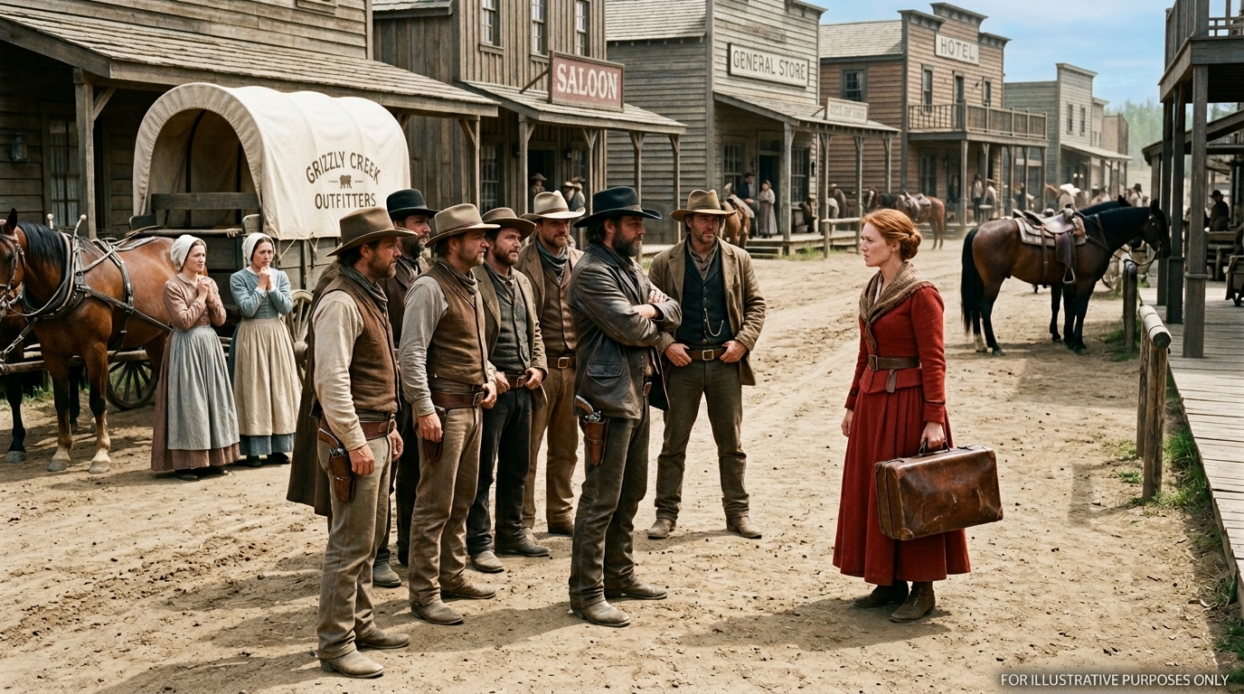 A woman in a striking red dress stepped down first. The fabric was elegant, layered, far finer than anything seen in Dry Creek. She held a brown leather suitcase in one hand, her posture straight, chin lifted. Auburn hair was pinned carefully, though the wind tugged at loose strands.