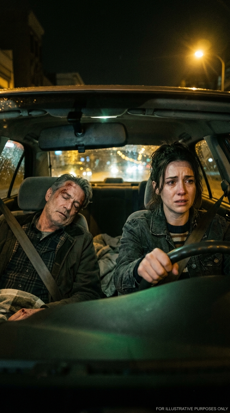 Neon beer signs flickered in dirty windows. A man in a stained apron stood outside smoking under the awning. Clara pulled up, rolled down her window an inch. “You the taxi?” the bartender asked. “Yeah.” He flicked his cigarette into a puddle. “He’s inside. Can you Can you help me get him to the car?” Clara’s stomach tightened. “How bad is he? He’s breathing.