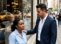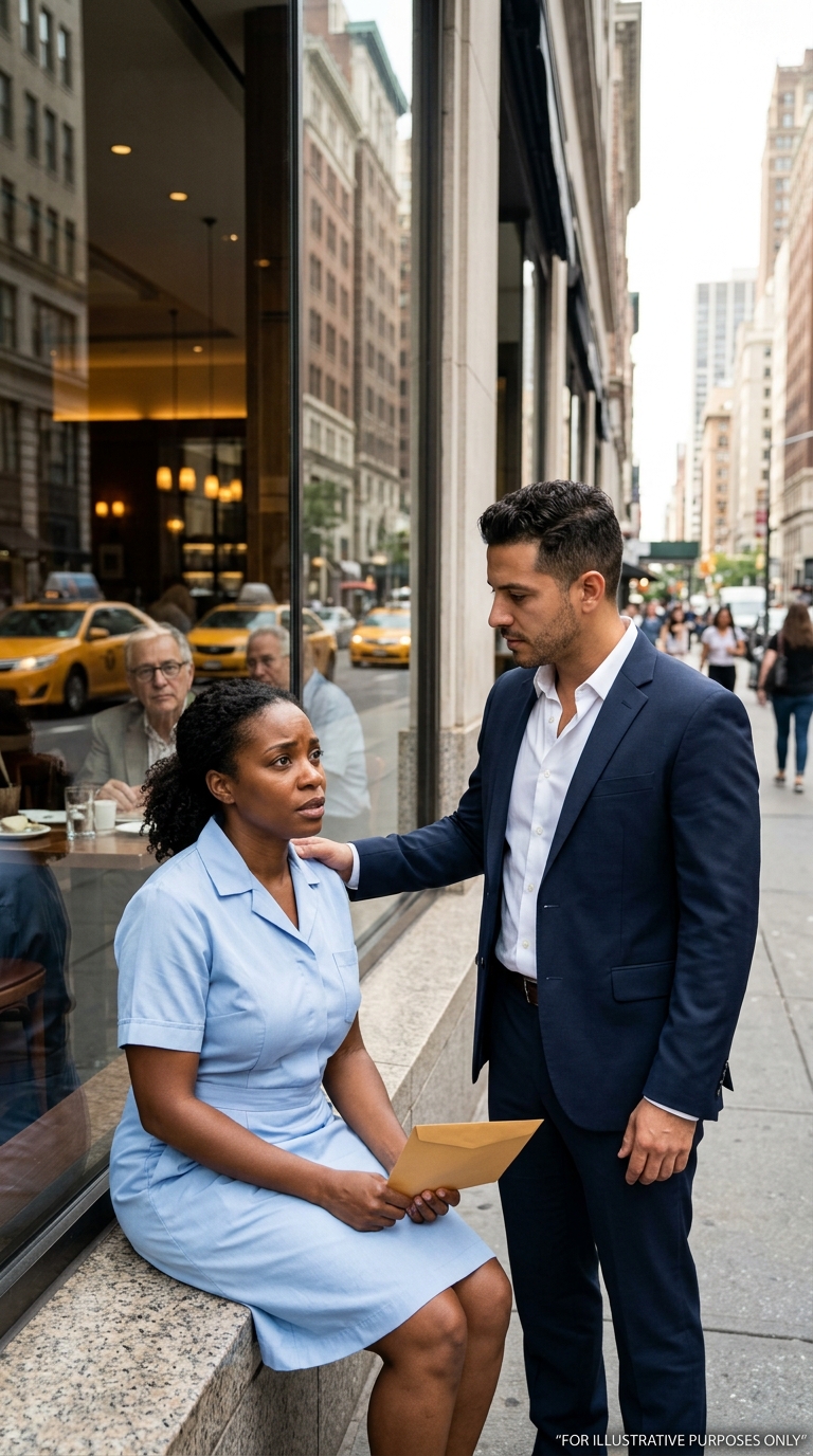 He let out a shaky breath that sounded almost like a laugh and almost like a sob. “Yes,” he said. “It’s me.” Then he looked at the bill still trapped in your fingers, at the cardboard you had been using to fan yourself, at the bright sun burning your shoulders while the cold luxury of the restaurant glowed behind the glass. Something changed in his face.