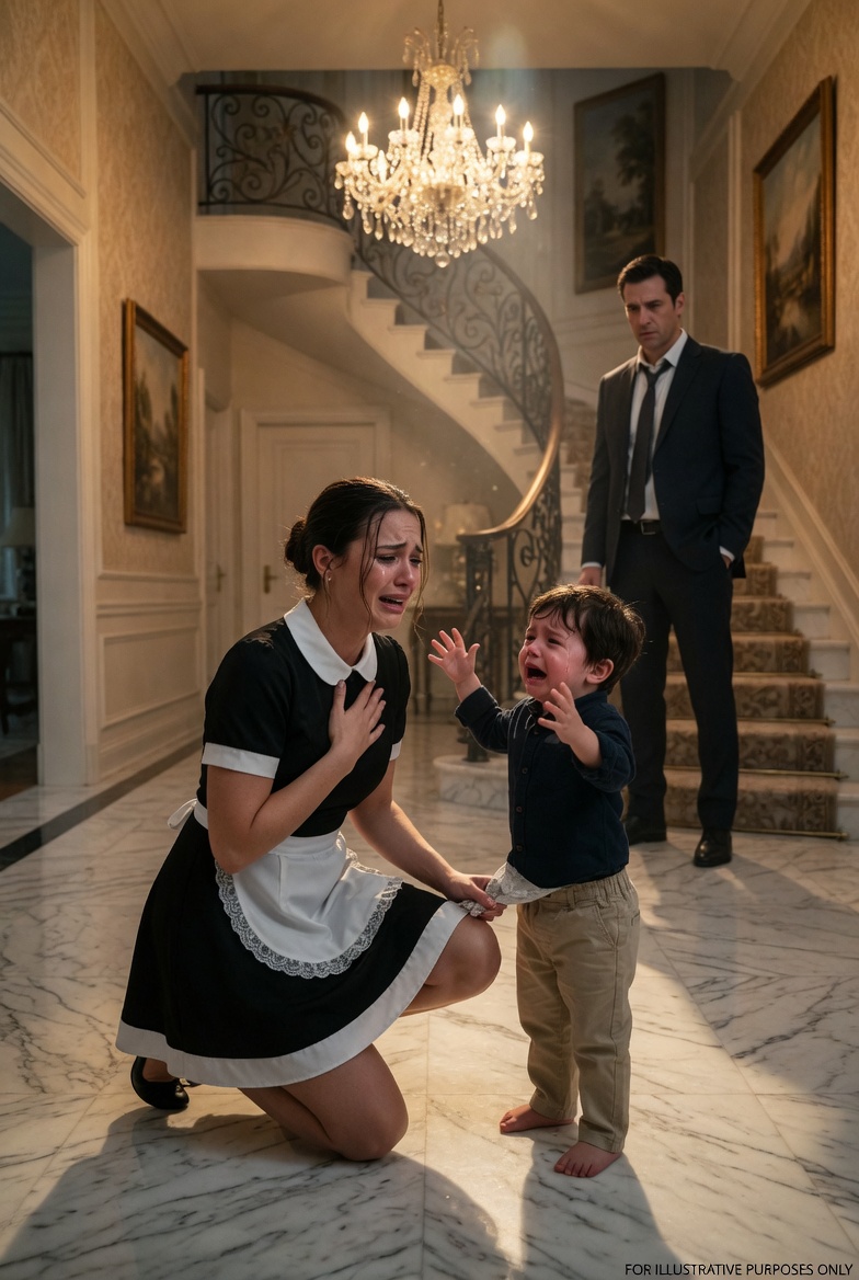 Mateo cries harder when he hears her voice, and you feel it immediately. His little body stiffens. His fingers dig into your shoulder. His breathing becomes wild again, uneven, terrified.