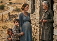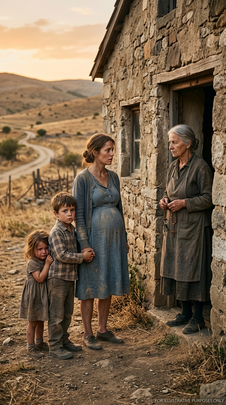 Mateo tightens his grip on your skirt. Sofía presses her face into your thigh, too tired to understand what she is seeing but frightened by the way your body has gone rigid. The old woman says nothing at first. She only opens the cabin door wider and tilts her head once, as if the mountain itself already decided you would come inside.