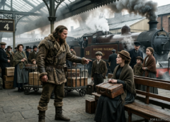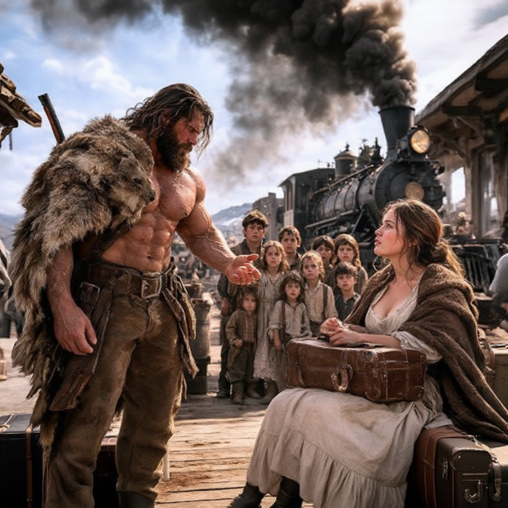 Iron wheels screamed as a black locomotive rolled slowly into place, its metal sides hissing. Steam burst upward, swallowing the sky in dark clouds. Travelers rushed along the wooden platform—men with hats pulled low, mothers clutching children, soldiers returning home, widows leaving towns that had forgotten them.