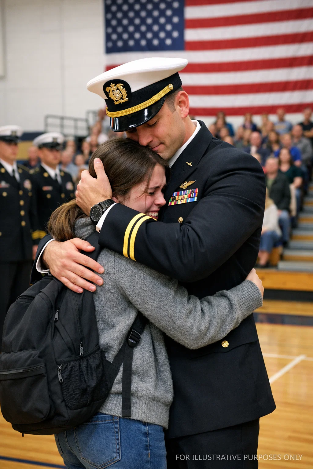 By the time I pushed through the double doors of the auditorium, the room was packed. Teachers lined the walls with strained expressions, and students filled every seat in a rare, heavy silence. On the stage stood the principal, looking like she had swallowed a bitter pill, and four Marines in their dress blues. They stood with a level of steady, practiced control that made the very air in the room feel different. One of them, an older man with silver at his temples, stepped toward the microphone and looked directly at Grace in the front row.