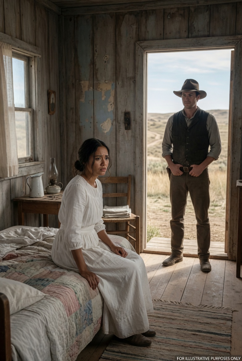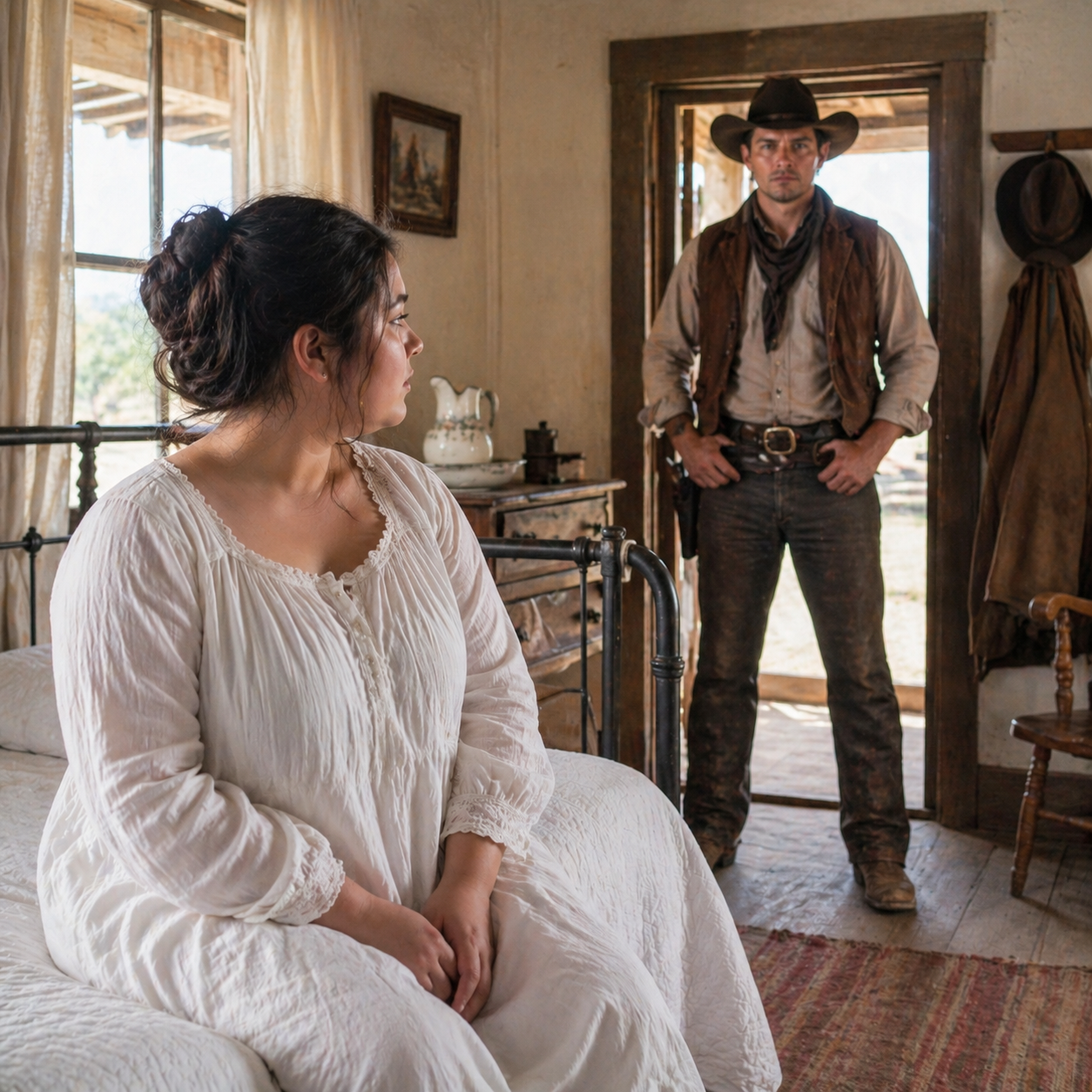 She perched on the edge, hands folded in her lap, her white nightgown falling in soft folds around her. Her dark hair, hastily pinned back, tugged at her scalp. The long journey from St. Louis still clung to her bones, and the weight of what she had agreed to pressed heavier than the travel dust.